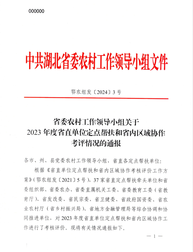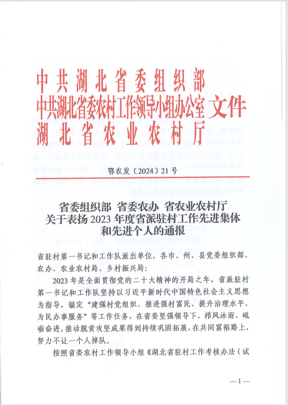 同時(shí),省農(nóng)業(yè)農(nóng)村廳印發(fā)的省委組織部、省委農(nóng)辦、省農(nóng)業(yè)農(nóng)村廳《關(guān)于表?yè)P(yáng)2023年度省派駐村工作先進(jìn)集體和先進(jìn)個(gè)人的通報(bào)》(鄂農(nóng)發(fā)[2024]21號(hào)),湖北清能投資發(fā)展集團(tuán)有限公司榮獲“2023年度工作突出派出單位”。