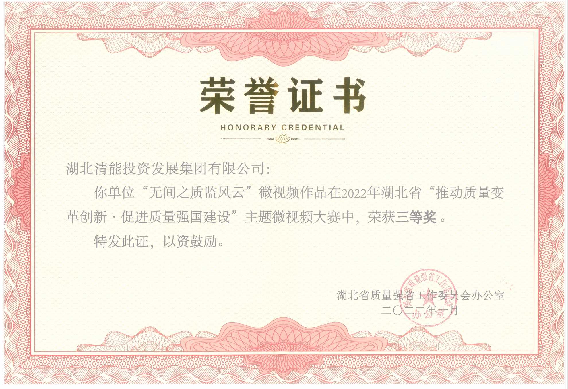 湖北省“推動質(zhì)量變革創(chuàng)新 促進(jìn)質(zhì)量強國建設(shè)”主題微視頻三等獎